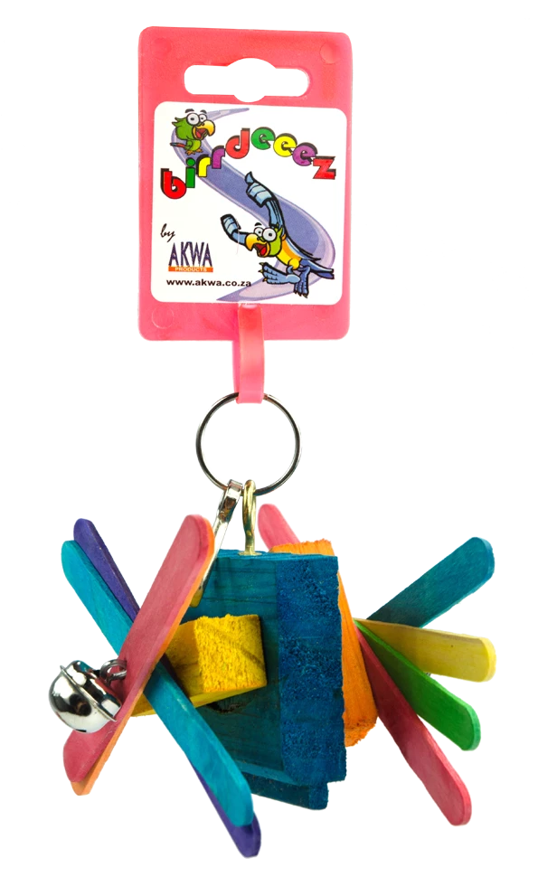 Vrolijk gekleurd vogelspeeltje. Draai de stokjes naar eigen wens in verschillende richtingen. De belletjes aan de boven en onderkant zorgen voor extra speelplezier. Bevestig dit speeltje gemakkelijk aan de kooi d.m.v. het karabijnhaakje. Formaat10,5 cm lang DoeldierKleine vogels, Parkieten en soortgelijke vogels.