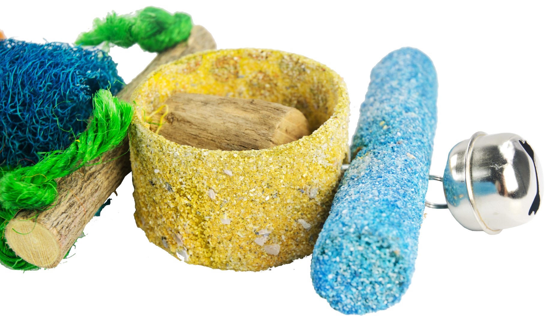 Groot klim- en speeltouw. Draagt bij aan het onderhoud van de pootjes en snavel van uw vogel. Makkelijk te monteren met behulp van een veiligheidshaak met manuele draaisluiting. Bevat blokjes met zandstructuur, gekleurd touw, hout en een leuke bel aan de onderzijde voor extra speelplezier. Lengte: 62 cmDoeldier: Grote papegaaien en ara’s