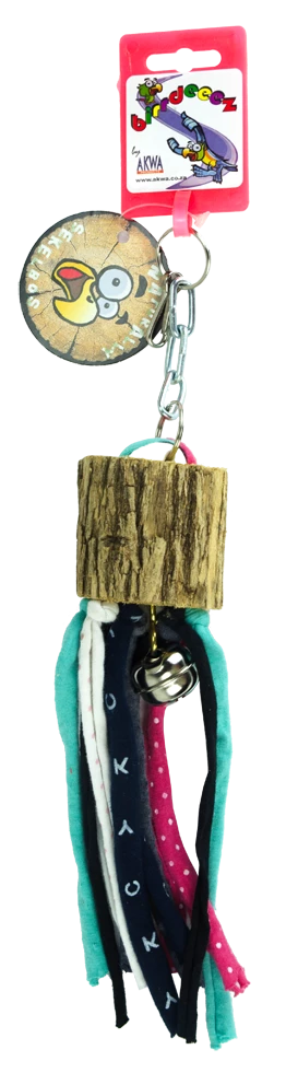 Vrolijk gekleurde speeltje van hout en jerseystof. BIRDBT3103 en 04 zijn voorzien van een belletje aan de onderzijde. Makkelijk te monteren met behulp van het karabijnhaakje of een vleugelmoer. DoeldierValkparkieten, parkieten en papegaaien en ara’s