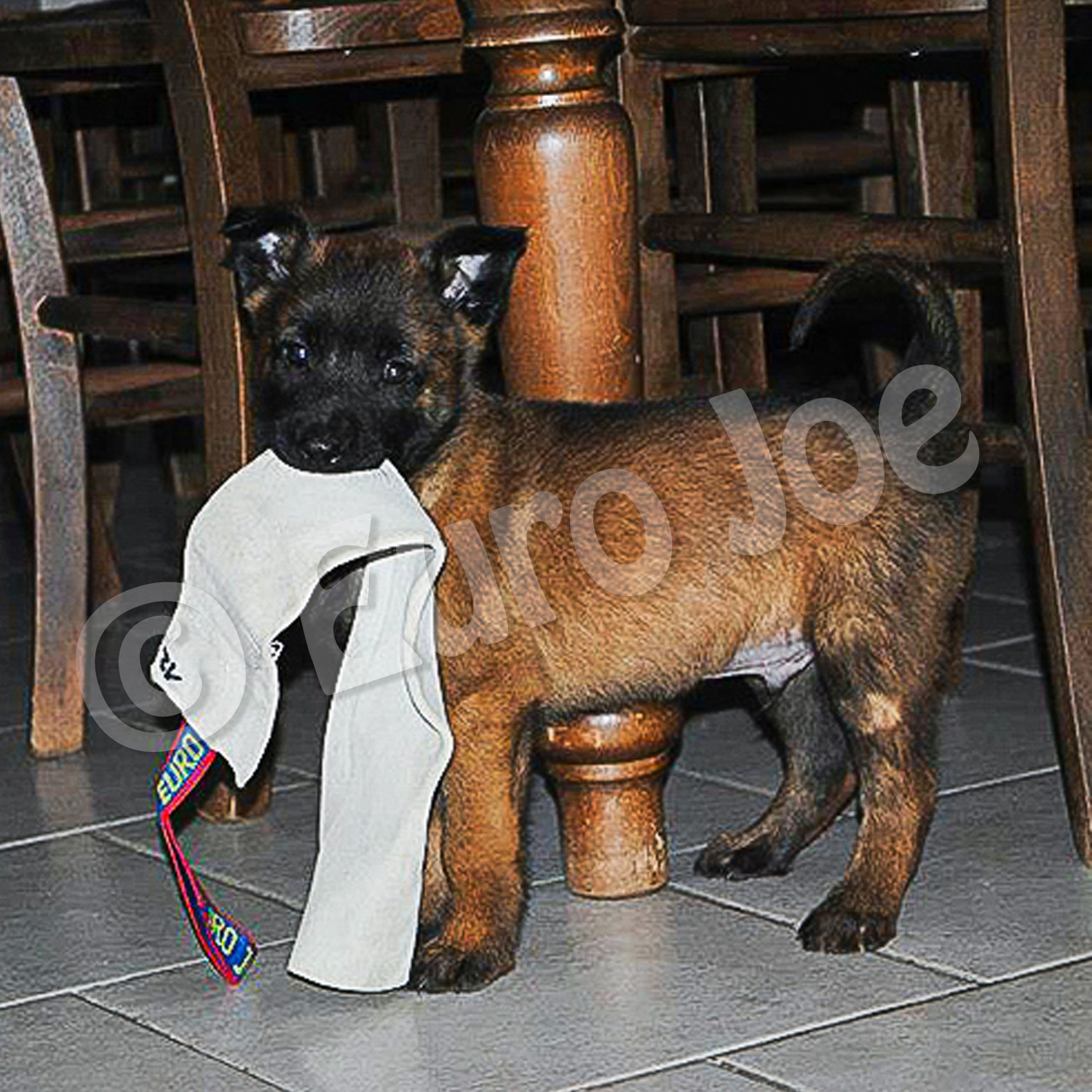 Biteleather for young dogs and puppies, in small or large. Ideal to teach pups and young dogs to bite strongly. Because it is made out of leather, the dogs need to bite powerfull, otherwise the biteleather is lost because it is too slippery to hold slightly. By turning and swaying and swinging the biteleather around, the hunting instinct of the dog can be awakened, and so its interest to bite it.