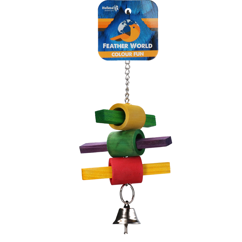 Houten speelgoed aan een hangertje, met belletje.