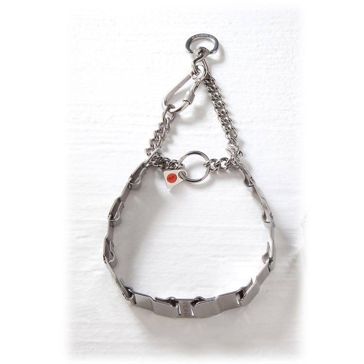 The Neck-tech fun with pull has a snap hook that cannot be opened accidentally. There are no pins found on this collar so he is called the “Fun” Neck tech collar. For both long-haired and short-haired dogs, the Neck Tech Fun is comfortable to wear. There is a pull system present so everything will fit nicely around the neck of your faithful companion. The top ring can fully rotate. This will cause the chain to have a shape that persist.