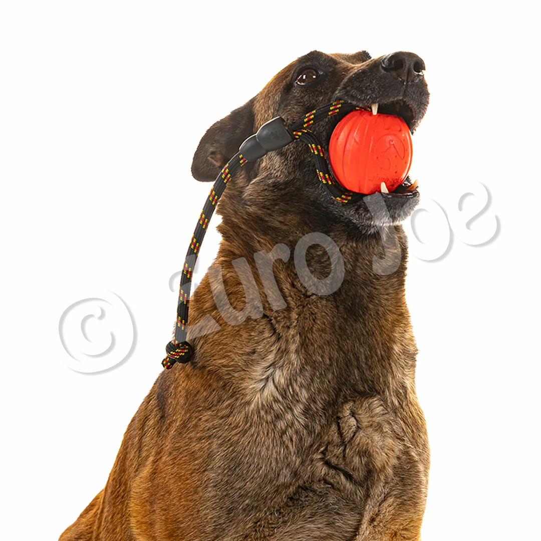The Super Red Ball with handle is a super strong ball made of EVA rubber. The ball is very light and floats. The foam rubber is very pleasant for the dog to hold and the dog cannot get hurt by it. The rope goes through the ball and allows you to hold the ball and have a tug of war with your dog. The rope also makes it easier for you to throw the ball away, or take it off the dog.